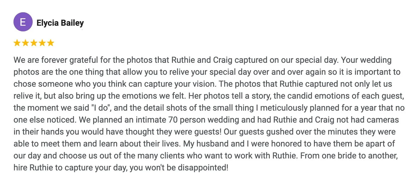 “Her warmth and professionalism were so comforting. She was quick to respond leading up to the wedding and provided our photos back to us in a very timely manner. We were so happy with every aspect of our wedding, and having Ruthie as our photographer was a VERY significant part of this. We are so grateful!”